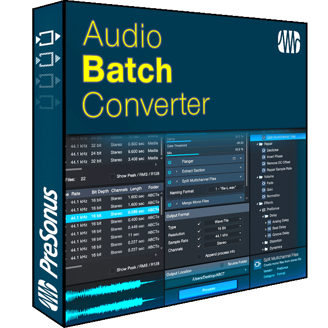 Audio Batch Converterを使用すると、複数のファイルに渡ってフォーマット変換(Wave、AIFF、FLAC、Ogg Vorbis、CAF、M4AおよびMP3)できるだけでなく、サードパーティVSTまたは11種類のオーディオ処理(マルチチャンネル・ファイル分割、サンプル・レート・リペアー、DCオフセット削除、フェード等)でプロセス可能。 それらの処理をプリセットに保存も可能です。全ての操作はもちろんドラッグ&ドロップ。 コラボレーターとのシェア、一貫したアセット配信、ヒューマン・エラーの軽減、ハードウェア・サンプラーの素材処理にも理想的です。
