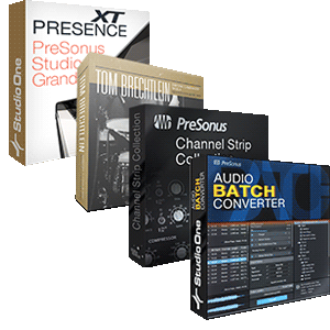 状態空間モデリングによるチャンネル・ストリップChannel Strip Collection、高度なバッチ処理をもたらすAudio Batch Converter、そして高品位なサウンド・ライブラリーであるTom Brechtlein Drums V1とPreSonus Studio Grand for Presenceをバンドル!約57%セーブでこれら即戦力をアドオン可能です。