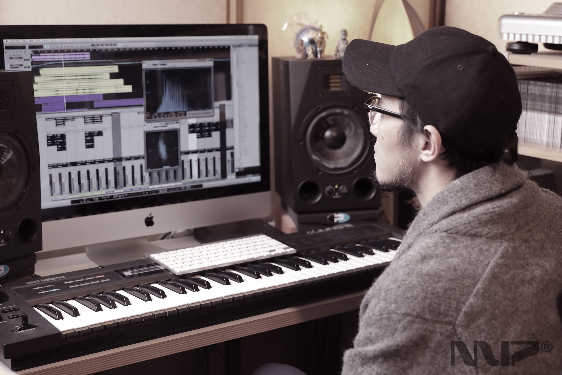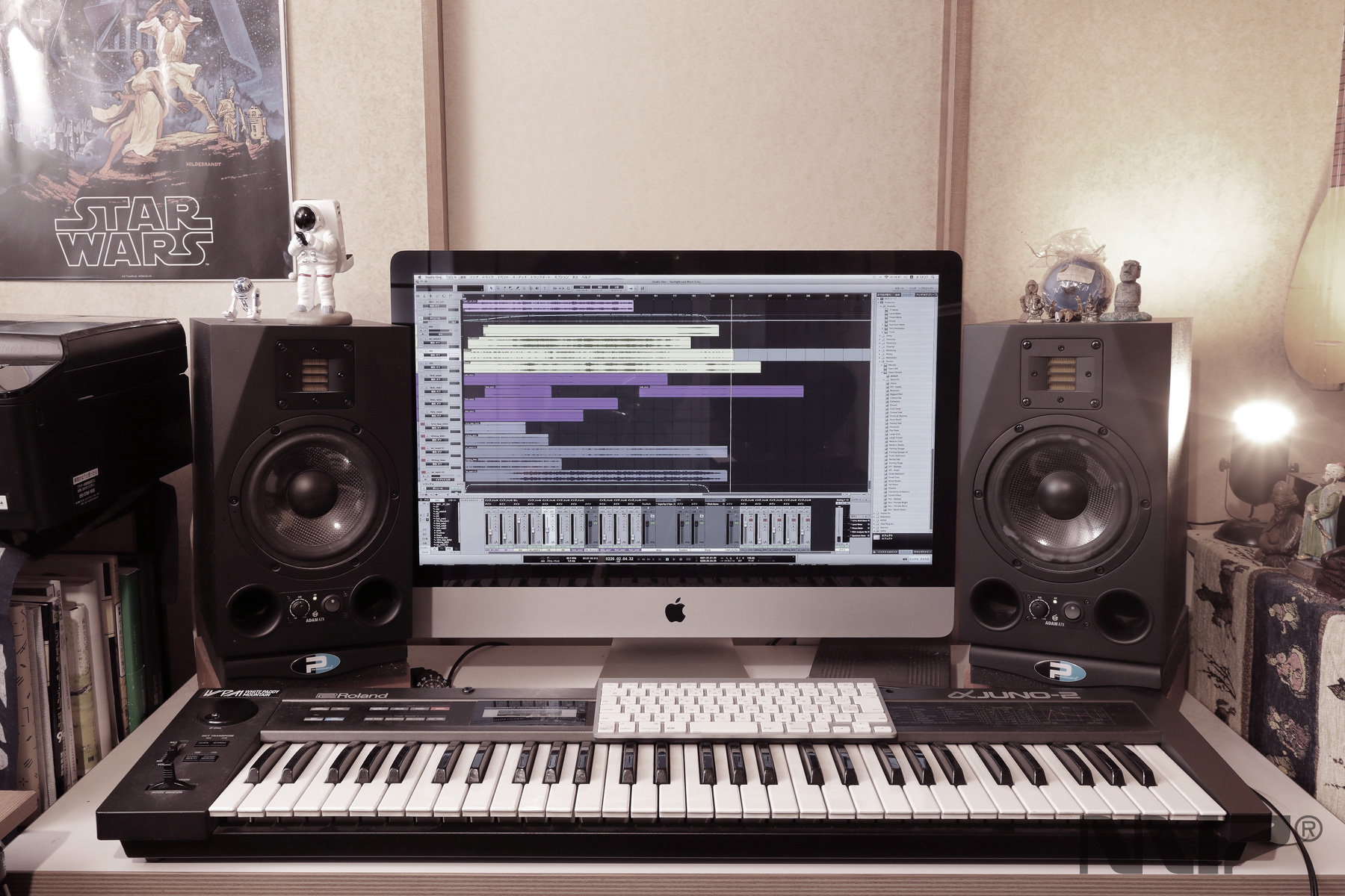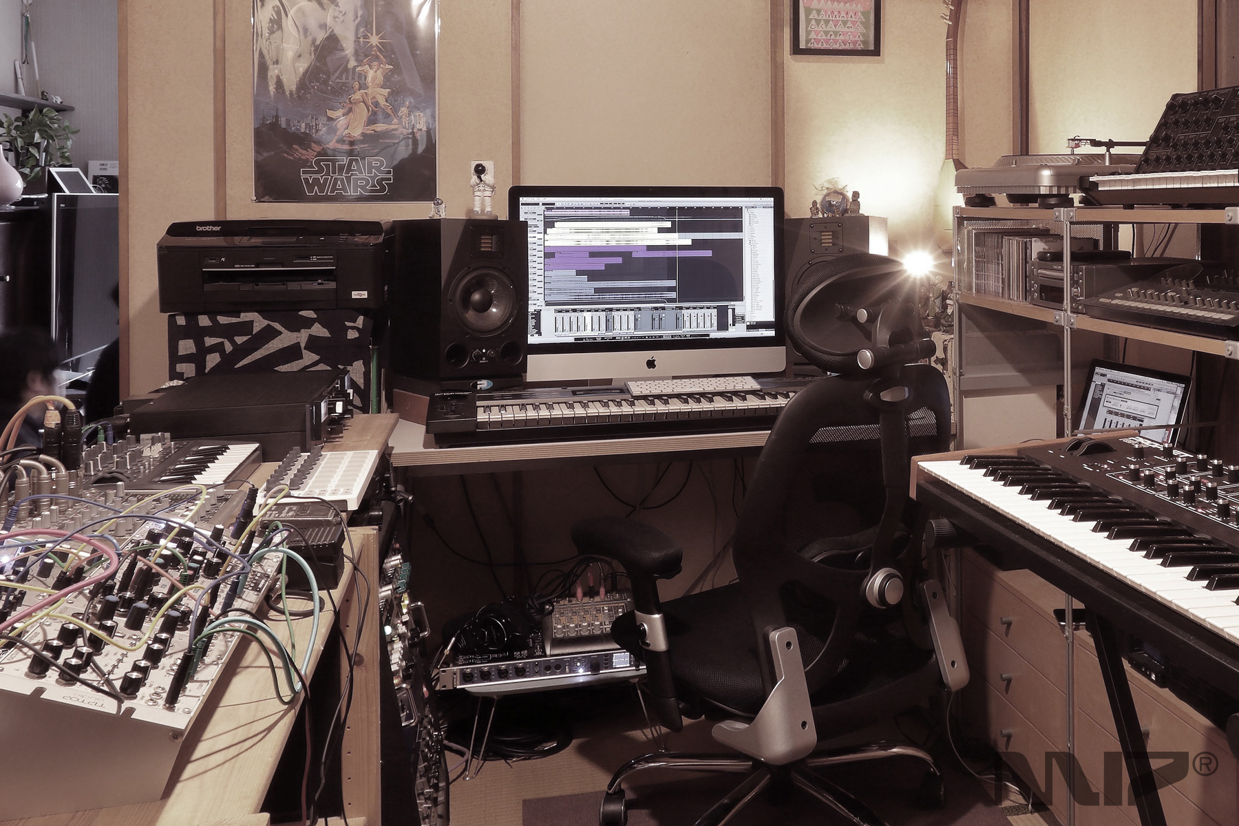 アナログ・シンセサイザー、ギター、ストンプ、アウトボード、各種コンバーターなどデジタル/アナログ機材を多数保有するプライベート・スタジオ