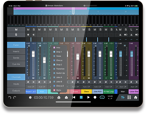 Apple App StoreおよびGoogle Play Storeから無料で入手できるFender Studio Pro Remoteでは、Fender Studio Proの基本的なレコーディングとミキシング機能をタッチ操作できます。タブレットをセカンド・スクリーンとして使用したり、ボーカルブースでのリモート録音用としてiPadからFender Studio Proをコントロールできます。トラックを録音準備したり、クリックを有効化したり、パンチインやプラグインのコントロールに使用したりと、様々に活用できます。